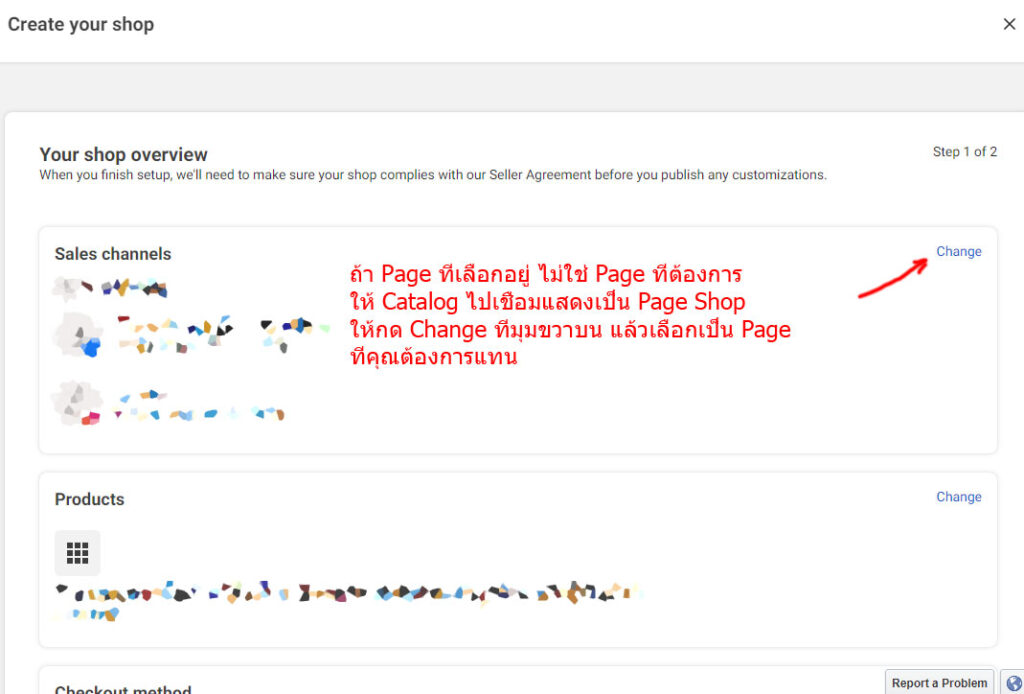 เข้า Facebook Commerce Manager ( สามารกดจากลิงก์ในหลังร้าน เพื่อให้มันตรงไปที่ Catalog ที่เชื่อมต่ออยู่กับร้านเลย โดยไม่ต้องกดหาเองจาก Dropdown ) เสร็จแล้วเลือกที่เมนู Sales > Shops > Connect a Facebook Business Page ตามภาพ