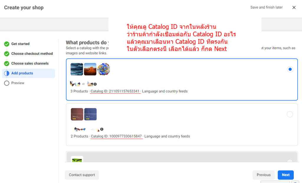 ถ้าเริ่มต้น มันเลือก Page อื่นอยู่ ที่ไม่ใช่เพจที่คุณต้องการจะเชื่อมกับ Catalog นี้ ให้คุณกดเปลี่ยน Page แล้วเลือก Page ที่คุณต้องการใช้งานมาแทน