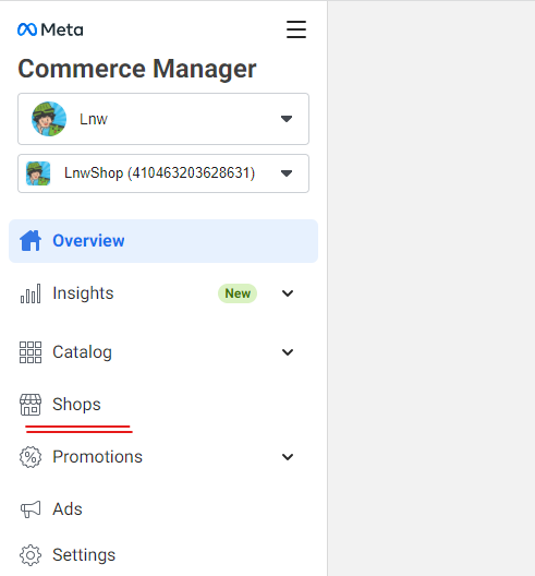 เมื่อเข้ามาที่ Commerce Manager แล้ว ให้คลิกเข้าที่เมนู Shops ที่อยู่ในแถบด้านซ้ายมือ