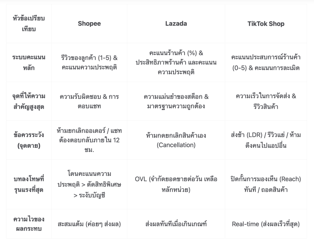 ผลกระทบเมื่อคะแนนลด: หลุดจากร้าน “ร้านค้าแนะนำ” (Preferred Seller), อันดับการค้นหาลดลง, เสียสิทธิ์แคมเปญ Marketing และหากคะแนนความประพฤติสูงมาก อาจถูกระงับบัญชี