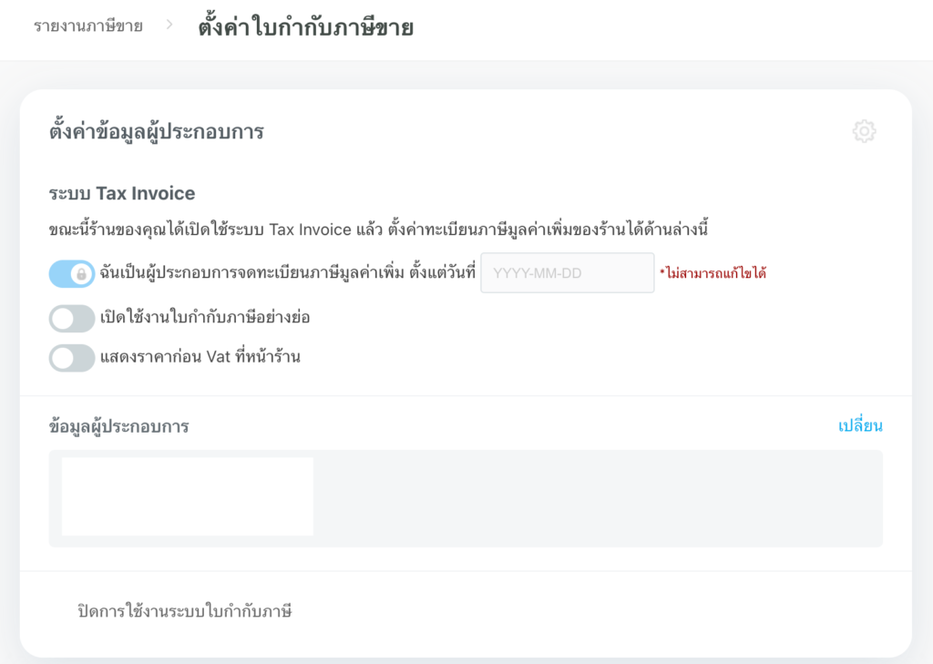 กรณีร้านค้าเข้าระบบ Vat แล้ว สามารถตั้งค่าผู้ประกอบการและเปิดระบบใบกำกับภาษีได้ที่
