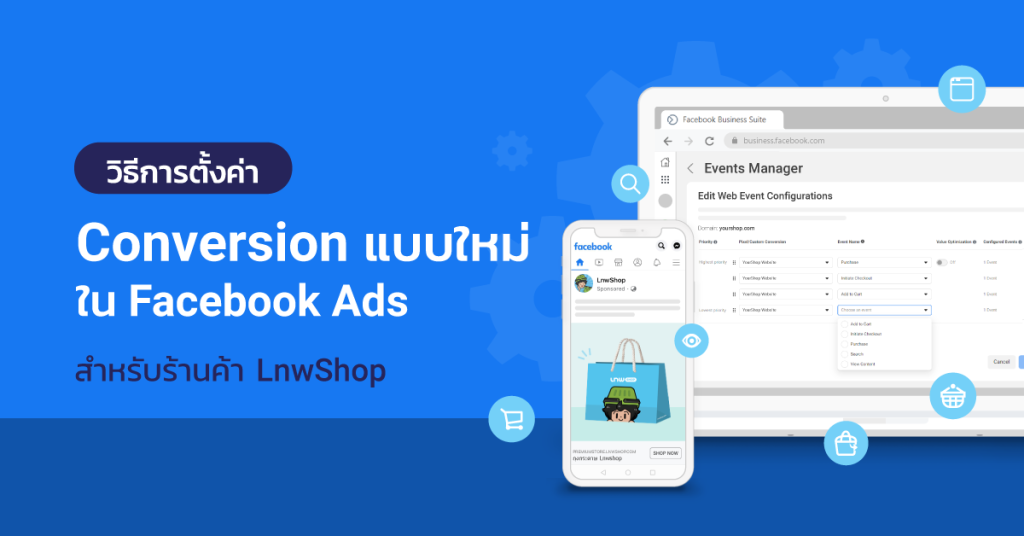 สำหรับเว็บไซต์ที่เป็น Subdomain ของ LnwShop เช่น yourshop.lnwshop.com เว็บไซต์เหล่านี้ จะถือว่าใช้งานอยู่ภายใต้โดเมน LnwShop.com ทั้งหมด ซึ่งจะไม่สามารถตั้งค่า Conversion แบบใหม่ได้ เนื่องจากกฎใหม่ของ Facebook มีการจำกัดการตั้งค่าไว้ที่ 8 Coversion ต่อเว็บไซต์ (จากเดิมไม่จำกัด) ด้วยปริมาณร้านค้ามหาศาล เราจึงไม่สามารถจะแบ่งโควต้า 8 Conversion ให้เพียงพอกับทุกร้านได้