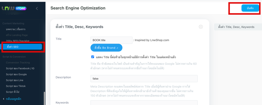 นอกจากนี้ทางเรายังมีเมนู seo checklist เพื่อช่วยให้ร้านค้าสมารถรีเช็คได้ว่าการทำ seo นั้นเพียงพอแล้วหรือควรปรับตรงไหนเพิ่มเติม ที่