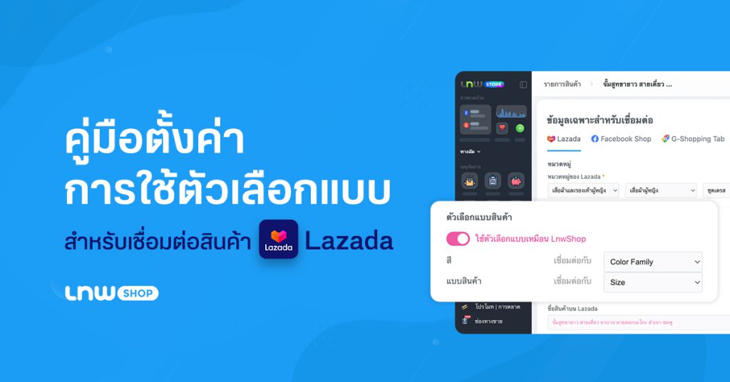 หากคุณใช้งานระบบเชื่อมต่อช่องทางขาย Lazada และต้องการส่งสินค้าไปสร้างเป็นตัวเลือกแบบสินค้า คุณสามารถตั้งค่าการใช้ตัวเลือกแบบสินค้าได้ผ่านระบบของ LnwShop