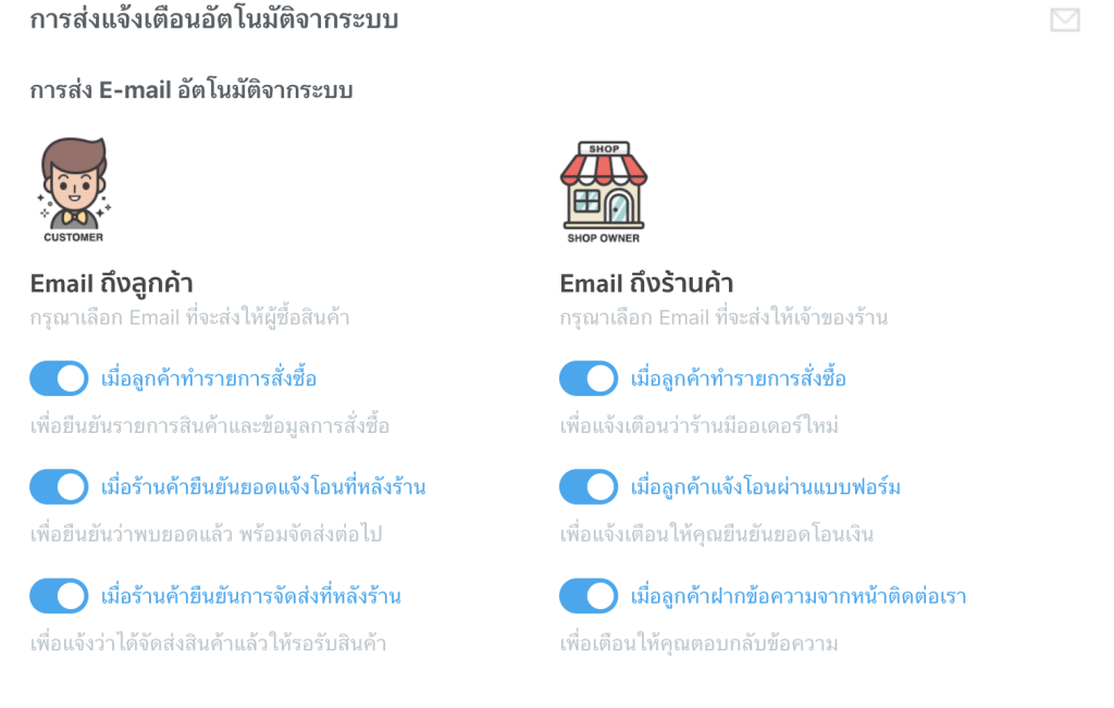 ร้านสามารถตั้งค่าการส่งอีเมลอัตโนมัติจากระบบให้ลูกค้าและให้เจ้าของร้าน เมื่อมีรายการสั่งซื้อเข้ามาได้ที่