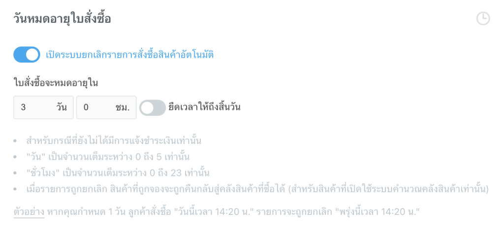 ร้านสามารถกำหนดวันหมดอายุใบสั่งซื้อได้ เช่น หากสั่งซื้อมา 1 วันแล้วยังไม่แจ้งชำระเงินรายการจะยกเลิกอัตโนมัติ ตั้งค่าที่