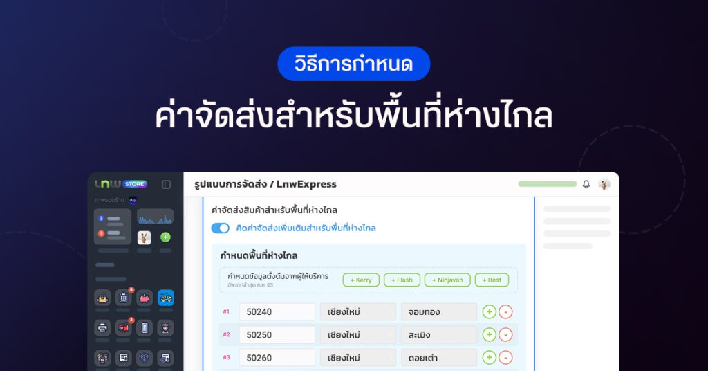 - เพิ่มพื้นที่จากข้อมูลตั้งต้นของแต่ละขนส่ง ซึ่งตอนนี้มี 4 ขนส่ง ได้แก่ Kerry Express, Flash Express, Ninja Van และ Best Express ทั้งนี้ หากขนส่งมีการเปลี่ยนแปลงข้อมูลพื้นที่ห่างไกล คุณจำเป็นต้องมาอัพเดทข้อมูลพื้นที่ให้เป็นข้อมูลล่าสุด ผ่านระบบจัดการ (โดยกดแก้ไขรูปแบบขนส่งที่ตั้งค่าไว้ > เลือกเพิ่มหรือลบพื้นที่ตามต้องการ และบันทึก)