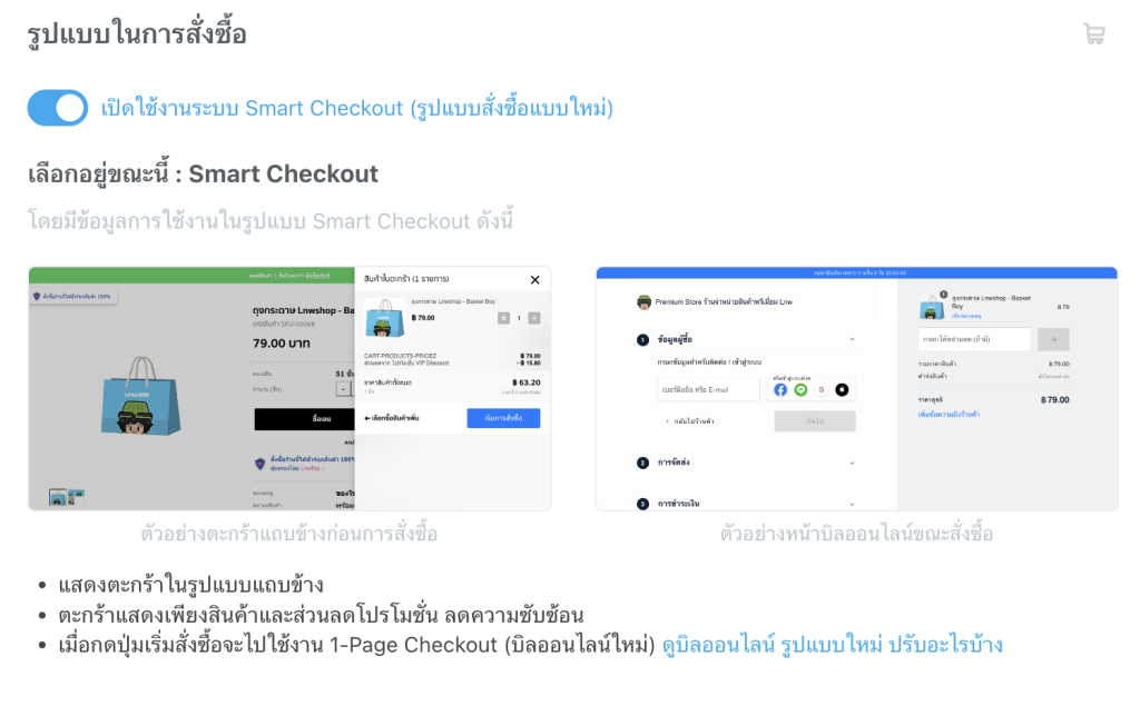 ตะกร้าสินค้าและรูปแบบการทำรายการสั่งซื้อจะมี 2 แบบ คือ standard checkout (แบบเดิม) และ smart checkout (แบบใหม่) ซึ่งสามารถตั้งค่าเปิดปิดรูปแบบเดิมหรือรูปแบบใหม่นี้ได้ที่