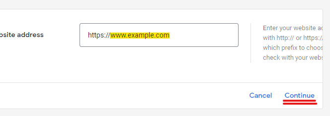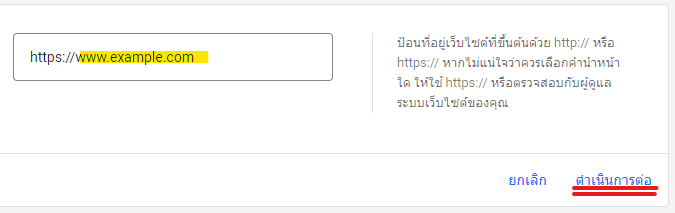 (4) คุณจะพบว่าปัจจุบัน มันเชื่อมอยู่กับโดเมนร้านค้าของคุณ ซึ่งนี่เป็นสาเหตุทำให้บัญชี Merchant Center ที่จะใช้งานกับทาง LnwShop ไม่สามารถเชื่อมกับโดเมนร้านค้าได้ จึงจำเป็นจะต้องปลดการเชื่อมนี้เสียก่อน โดยให้ เปลี่ยน “Your website address” เป็นอะไรก็ได้ ที่ไม่ใช่โดเมนร้านค้าของคุณ เช่น https://www.example.com แล้วกด “Continue” ดังภาพ